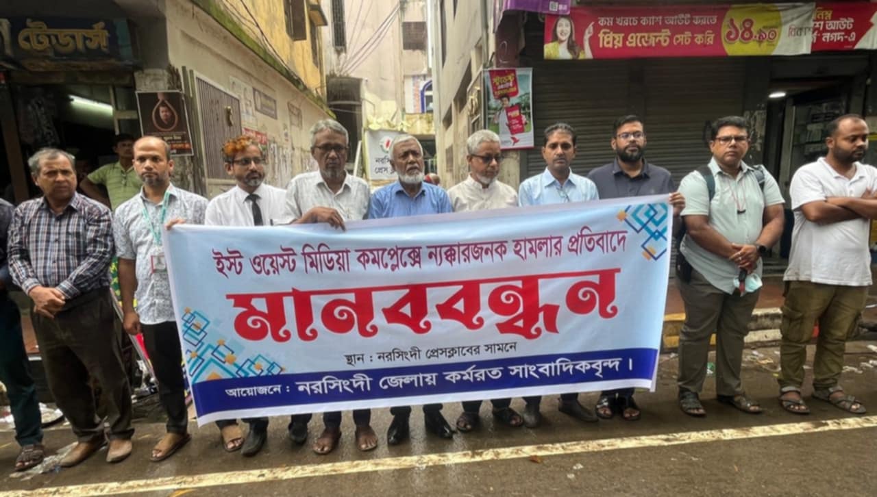 ইষ্ট ওয়েষ্ট মিডিয়া কমপ্লেক্সে হামলার প্রতিবাদে নরসিংদীতে সাংবাদিকদের মানববন্ধন