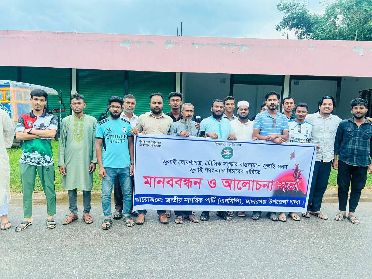কেন্দ্রীয় নির্দেশনা মোতাবেক জাতীয় নাগরিক পার্টি জাতীয় যুব শক্তি, মাদারগঞ্জ উপজেলা শাখা এবং বাংলাদেশ গণতান্ত্রিক ছাত্রসংসদের সম্মিলিত উদ্যোগে মানববন্ধন ও আলোচনা সভা অনুষ্ঠিত হয়েছে।