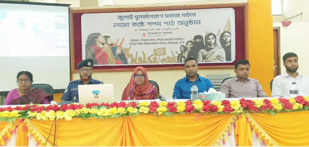 শনিবার ২৬ জুলাই সকাল ৯:৩০মিনিটে উপজেলা নির্বাহী অফিসার মুর্শিদা খাতুন এর সভাপতিত্বে ও উপজেলা আইসিটি ও তথ্য অফিসার রাসেল রানার সঞ্চালনায় অনুষ্ঠানটি পরিচালিত হয় ।অনুষ্ঠানে জুলাই কে কেন্দ্র করে রাষ্ট্রীয় পর্যায়ে কেন্দ্রে অনুষ্ঠিত ভিডিও কনফারেন্স এর মাধ্যমে সরাসরি অনুষ্ঠানটি সম্প্রচার করা হয় । এতে করে সকল উপস্থিতিত সদস্যগণ সরাসরি সম্প্রচার অনুষ্ঠানটি উপভোগ করেন এবং জুলায়ে নিহত শহীদদের প্রতি শ্রদ্ধা জানিয়ে এক মিনিট নিরবতা পালন করা হয়। জুলাই শহীদদের উদ্দেশে দোয়া ও বিশেষ মোনাজাত করা হয়।