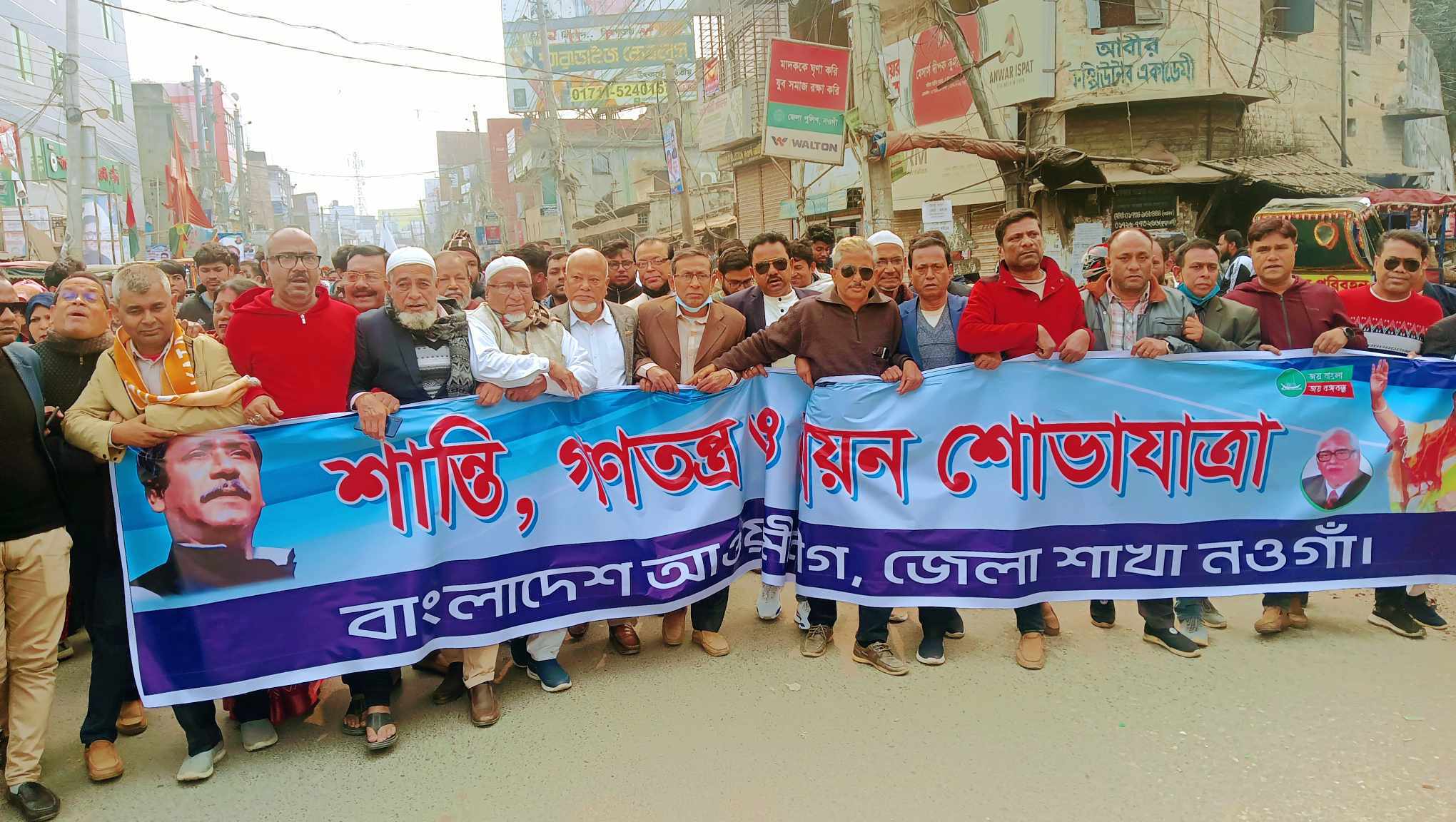 এ সময় আরও উপস্থিত ছিলেন জেলা আওয়ামী লীগের সহ সভাপতি ও জাতীয় কমিটির সদস্য আঃরহমান, যুগ্ম সাঃসম্পাদক বিভাষ মজুমদার গোপাল সাংগঠনিক সম্পাদক তাজুল ইসলাম তোতা, দপ্তর সম্পাদক আঃলতিফ বকুল, সদর উপজেলা আওয়ামী লীগের সভাপতি বীরমুক্তি যোদ্ধা, মাহবুবুল হক কোমল, সাঃসম্পাদক আলহাজ্ব, বীরমুক্তি যোদ্ধা রেজাউল করিম, মহিলা আওয়ামী লীগের সভাপতি পারভীন আক্তার, কৃষক লীগের আহবায়ক আঃওয়াহাব, যুগ্ম আহবায়ক খোরশেদ আলম, শ্রমিক লীগের সভাপতি আঃমজিদ, যুবলীগের সাধারণ সম্পাদক বীমান কুমার রায়, যুবমহিলা লীগের সাঃসম্পাদক ফেন্সি আক্তার, সেচ্ছাসেবক লীগের সভাপতি মোঃরাসেল আহমেদ সাঃসম্পাদক নূরমোহাম্মদ লাল,ছাত্র লীগের সভাপতি সাব্বির আহমেদ রিজভী সাঃসম্পাদক সিউল আহমেদ। শহরের বিভিন্ন মূল সরক প্রদীক্ষন করে আবারও জেলা আওয়ামী লীগ অফিসের সামনে এসে শেষ হয়।মিশিল শেষে বিভিন্ন সংগঠনের জেলা পর্যায়ে সভাপতি ও সাঃসম্পাদক গন বক্তব্য রাখেন। এই সভা পরিচালনা করেন জেলা আওয়ামী লীগের যুগ্ম সাঃসম্পাদক বিভাষ মজুমদার গোপাল। বিভিন্ন বক্তরা বলেন, আজ শান্তি পূর্ন ভোটের মাধ্যমে দ্বাদশ জাতীয় সংসদ নির্বাচন হয়েছে। দেশী,বিদেশি মিডিয়া এবং রাষ্ট্রদূত গন ভূয়সী প্রশংসা করেছেন যে বাংলাদেশে একটা সঠিক ও নিরপেক্ষ নির্বাচন হয়েছে কিন্তু বি এন পি দল ভোটে যায় নাই কারণ তাদের একটা বিশাল ভরাডুবি হবে। আজ তারা ঘোষণা করেছে কালো পতাকা মিছিল করবে তাদের এই দাঁত ভাঙা জবাব দেওয়ার জন্য সারা দেশের ন্যায় নওগাঁ জেলা আওয়ামী লীগের উদ্যোগে এই বিশাল শান্তি, গনতন্ত্র উন্নয়ন শোভাযাত্রা হয়েছে।
