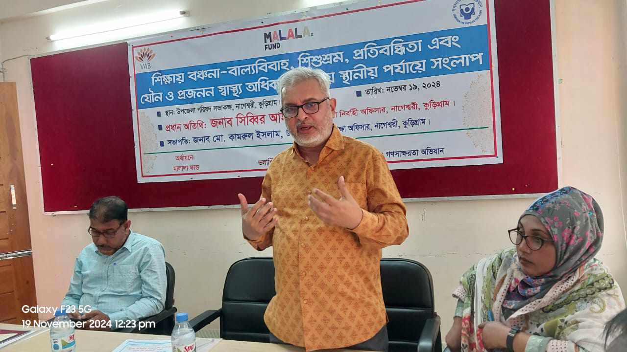 স্বেচ্ছাসেবী সংস্থা ভলান্টিয়ার্স অ্যাসোসিয়েশন ফর বাংলাদেশ (ভাব) ও গণসাক্ষরতা অভিযানের সহযোগিতায় এবং মালালা ফান্ডের অর্থায়নে শিক্ষায় বঞ্চনা বাল্যবিবাহ, শিশুশ্রম, প্রতিবন্ধিতা এবং যৌন ও প্রজনন স্বাস্থ্য অধিকার বিষয়ে স্থানীয় পর্যায়ে সংলাপ অনুষ্ঠিত হয়। উপজেলা মাধ্যমিক শিক্ষা অফিসার কামরুল ইসলামের সভাপতিত্বে ও ভাব বাংলাদেশের সহকারী কান্ট্রি ডিরেক্টর এম এ আলিম খানের সঞ্চালনায় অনুষ্ঠিত সংলাপ অনুষ্ঠানে প্রধান অতিথি হিসেবে উপস্থিত ছিলেন উপজেলা নির্বাহী অফিসার সিব্বির আহমেদ। অনুষ্ঠানে বক্তব্য রাখেন ভাব বাংলাদেশের কান্ট্রি ডিরেক্টর হাসনাইন সবিহ নায়ক, নাগেশ্বরী উপজেলা পরিষদের সাবেক নারী ভাইস চেয়ারম্যান আমিনা বেগম অনন্যা, নাগেশ্বরী উপজেলা মাধ্যমিক শিক্ষক সমিতির সভাপতি কে এম আনিচুর রহমান, উপজেলা মাদ্রাসা শিক্ষক সমিতির সাধারণ সম্পাদক সোহরাব আলী, নাগেশ্বরী বুদ্ধি প্রতিবন্ধী ও অটিস্টিক বিদ্যালয়ের প্রধান শিক্ষক লাকী খাতুন, নাগেশ্বরী প্রেস ক্লাবের সভাপতি ওমর ফারুক, বীর মুক্তিযোদ্ধা মোমিন উদ্দীন, গোলাপ খাঁ শিশু সদনের কো-অর্ডিনেটর সব্যসাচী সাহা, নাগেশ্বরী আদর্শ পাইলট বালিকা উচ্চ বিদ্যায়ের প্রধান শিক্ষক মোশাররফ হোসেন, নাখারগঞ্জ বহুমুখী উচ্চ বিদ্যালয়ের প্রধান শিক্ষক নূর ইসলাম মিয়া, রায়গঞ্জ বালিকা উচ্চ বিদ্যালয়ের প্রধান শিক্ষক শফিকুল ইসলাম, শিক্ষার্থী অহনা সেন, অভিভাবক জামিলা আক্তার প্রমুখ।