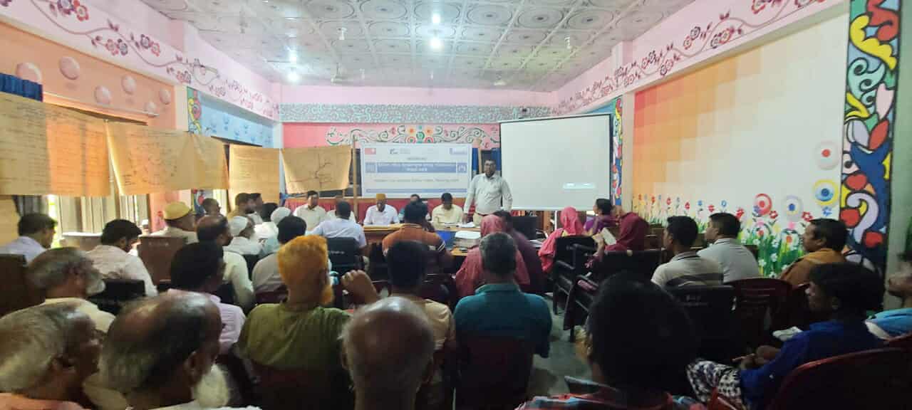 সভাপতিত্ব করেন ইউনিয়ন পরিষদের প্যানেল চেয়ারম্যান ওয়াজেদ আলী ও কর্মশালাটি সঞ্চালনা করেন ইউনিয়ন প্রশাসনিক কর্মকর্তা জাহাঙ্গীর আলম খান ।কর্মশালায় প্রধান অতিথি হিসেবে উপস্থিত ছিলেন জাকির হোসেন সমাজ সেবক ও বিশেষ অতিথি হিসেবে উপস্থিত ছিলেন বিশিষ্ট সমাজসেবক ও শিক্ষক মনজুর রাসেল। উপস্থিত ছিলেন ইউনিয়ন ও ওয়ার্ড দুর্যোগ ব্যবস্থাপনা কমিটির সকল সদস্য, ইউপি সদস্যবৃন্দ, স্থানীয় গণ্যমান্য ব্যক্তিবর্গ, সুশীল সমাজের প্রতিনিধি, যুব প্রতিনিধিগণ,সাংবাদিকগণ এবং ইএসডিও’র কর্মীবৃন্দসহ অনেকেই।সভার লক্ষ্য ও উদ্দেশ্য তুলে ধরেন কলি ইয়াসমিন(সিএসডিএল)। সভায় ওয়ার্ড ভিত্তিক দুর্যোগ ব্যবস্থাপনা কমিটির প্রতিনিধিরা তাদের নিজ নিজ ওয়ার্ডে অংশগ্রহণমূলকভাবে কীভাবে জলবায়ু পরিবর্তনজনিত বিপন্নতা বিশ্লেষণ ও যাচাই করেছেন তা উপস্থাপন করেন। সেইসঙ্গে ওয়ার্ড ভিত্তিক সম্ভাব্য কর্মপরিকল্পনাও ইউনিয়ন দুর্যোগ ব্যবস্থাপনা কমিটির নিকট উপস্থাপন করা হয়। উক্ত অনুষ্ঠানে উপস্থিত সকল ধরনের ব্যাক্তি বর্গের মতামতের ভিত্তিতে ওয়ার্ডভিত্তিক তথ্যসমূহ যাচাই-বাছাই (ভ্যালিডেশন) করে চূড়ান্ত করা হয়। এই কার্যক্রম ইউনিয়ন পর্যায়ে জলবায়ু সহনশীল উন্নয়ন পরিকল্পনা গ্রহণ,বাজেটে অন্তভূক্তিকরণ,পঞ্চবার্ষিকী পরিকল্পনার ক্ষেত্রে উপরের বিষয়ে গুরুত্বপূর্ণ ভিত্তি হিসেবে কাজ করবে বলে অংশগ্রহনকারীগন জানান।