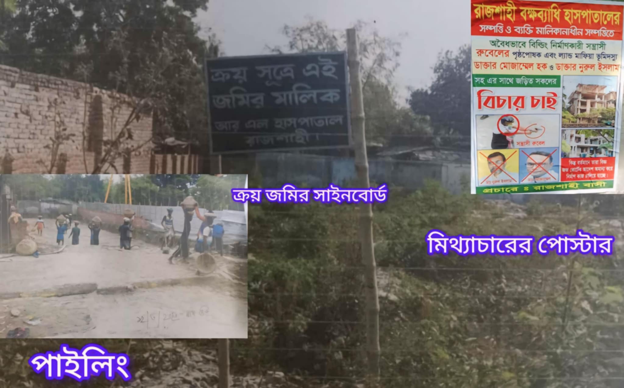 জানা গেছে, চিকিৎসক নুরুল ইসলাম ও মোজাম্মেল হকসহ আরও কয়েকজন চিকিৎসক মিলে উক্ত জায়গাটি ক্রয় করেন তাঁরা। ক্রয়ের পর থেকে সাইনবোর্ড দেওয়া পাইলিং করাসহ অন্যান্য কাজের আগেও কেউ ওই জমির মালিক বা অংশিদার দাবি না করলেও বাড়ী তৈরির ৮০ শতাংশ হওয়ার পর একটি মহল শুধুমাত্র হয়রানির লক্ষ্যে বাঁধা সৃষ্টি করছেন। খাজনা- খারিজসহ সরকারি দপ্তরে সকল কাজ সম্পূর্ণ হওয়ার পর কেনো তারা এমন অভিযোগ তুলছেন তা তাঁদের বোধগম্য নয়। বিষয়টি নিয়ে মামলা চলার পরও শুধুমাত্র সম্মানহানির লক্ষ্যে একটি নির্দিষ্ট গোষ্ঠী জমির বিষয়টিকে ভিন্নখাতে নেওয়ার অপচেষ্টা করছেন বলে জানা গেছে। চক্রটি আইনি লড়াইয়ে কোনো সুবিধা না করতে পেরে এখন রাজনৈতিক অন্য ঘটনার সঙ্গে জড়িয়ে সারা শহর মিথ্যাচার করে পোস্টার লাগিয়ে বেড়াচ্ছেন।