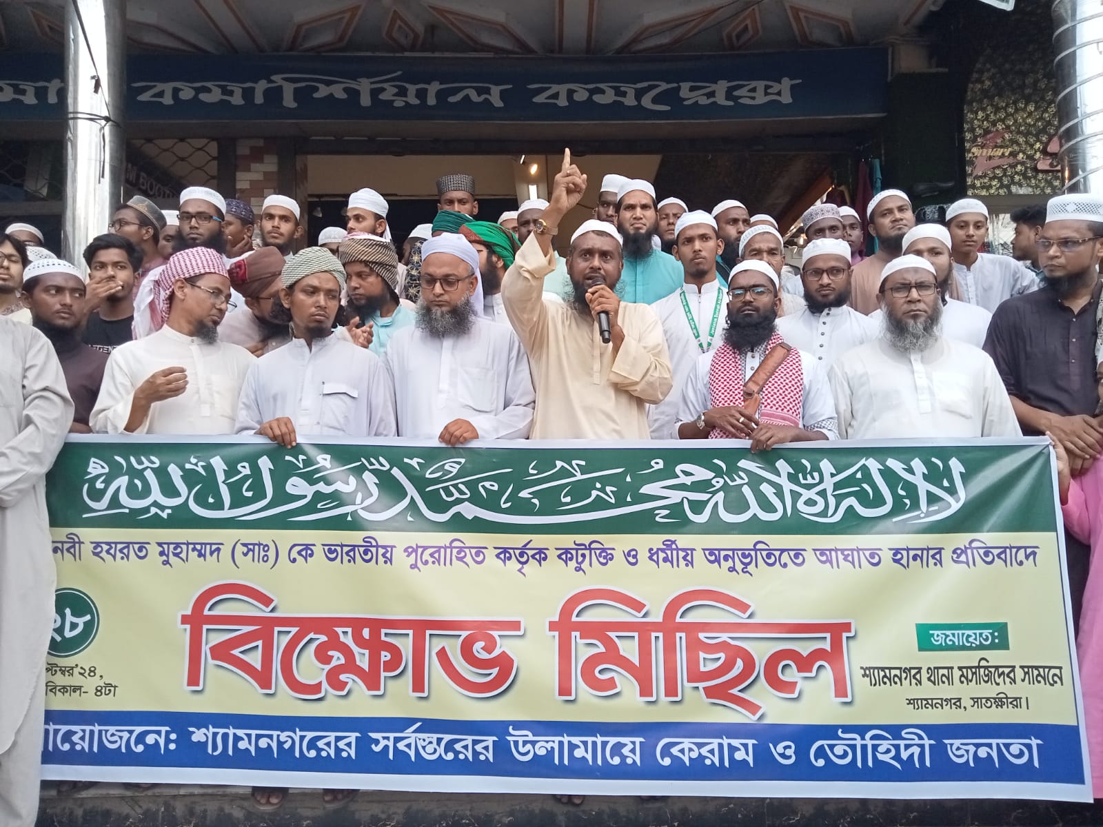 শ্যামনগরে সর্বস্তরের ওলামা একরাম ও তৌহিদি জনতা আয়োজনে শত শত ধর্মপ্রাণ মুসলমান ও বিভিন্ন মসজিদের ইমাম,মাদ্রাসার শিক্ষক ও ছাত্র উপস্থিতি ছিলেন।প্রতিবাদ সমাবেশে বক্তব্য রাখেন,থানা মাদ্রাসার মুহাদ্দিস মাওলানা মোস্তফা কামাল,হাফেজ রবিউল ইসলাম, শ্রীফলকাটি দাওরা হাদিস মাদ্রাসার মুহতামিম মুফতি জিয়াউর রহমান, মাওলানা আবু বক্কর সিদ্দিক, আলহাজ্ব মাওলানা হাফিজুর রহমান, কুলতলি মাদ্রাসার মুহতামিম মাওলানা হাফিজুর রহমান, হাসপাতাল জামে মসজিদের পেশ ইমাম আলহাজ্ব মাওলানা আজাদ হুসাইন প্রমুখ।
