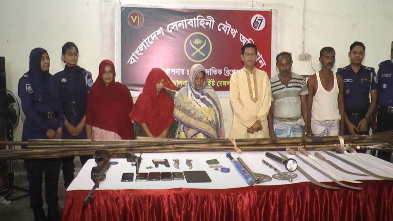 মাদারীপুরে বিপুল পরিমাণ দেশি-বিদেশি অস্ত্রসহ ৬ জনকে আটক করেছে যৌথ বাহিনী। শুক্রবার (২৫ জুলাই) ভোরে সদর উপজেলার শিরখাঁড়া ইউনিয়নের ঘুনসি গ্রাম থেকে তাদের আটক করা হয়।আটকরারা হলেন, ঘুনসি গ্রামের শাহ আলম মাতুব্বরের ছেলে কালাম মাতুব্বর (৫৩), একই গ্রামের মৃত আব্দুল করিম মাতুব্বরের ছেলে মিলন মাতুব্বর (৫৪), শাহ আলম মাতুব্বর ছেলে মনু মাতুব্বর (৫০), কালাম মাতুব্বরের স্ত্রী লাকি বেগম (৪৫), মফিজ মাতুব্বরের স্ত্রী পারুল বেগম (৪৫) ও শিহাব মাতুব্বরের স্ত্রী খাদিজা আক্তার (২৩)।সেনাবাহিনীর মাদারীপুর ক্যাম্পের কমান্ডার মেজর কাজী ফয়সাল ফারুক জানান, ওই গ্রামের কয়েকটি বসতবাড়িতে বিপুল পরিমাণ দেশি-বিদেশি অস্ত্র মজুদ রাখা আছে এমন খবরে সেখানে অভিযানে যায় সেনাবাহিনী ও সদর মডেল থানা পুলিশ। পরে তল্লাশি চালিয়ে সেখান থেকে ১টি পিস্তল, একটি ইয়ার গান, ১টি ম্যাগাজিন, একটি কাটা রাইফেল, ১২৫ রাউন্ড গুলি ও বিপুল পরিমাণ দেশীয় অস্ত্র উদ্ধার করা হয়। জব্দ করা হয় ৫টি মোবাইল ফোন ও ল্যাব। আটক করা হয় তিন নারীসহ ৬ জনকে। পরে তাদের সদর মডেল থানা পুলিশের কাছে হস্তান্তর করে সেনাবাহিনী।