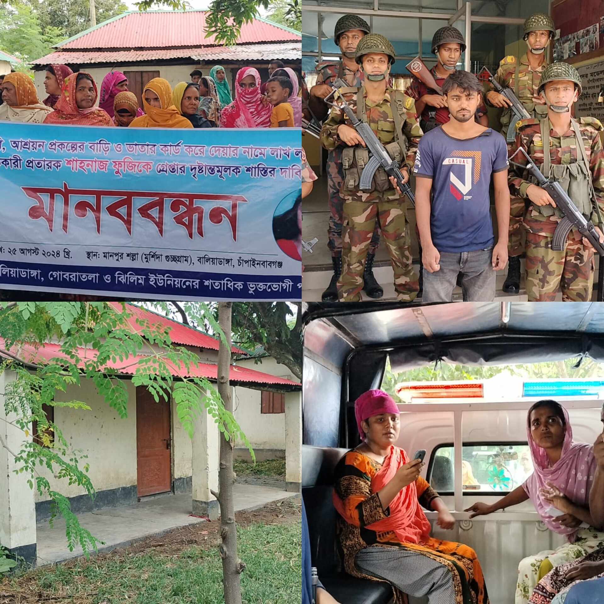 সদর উপজেলার বালিয়াডাঙ্গা ইউনিয়নের সল্লা গ্রামের ভুক্তভোগী রোকেয়া বেগম জানান, স্বামী পরিত্যক্ত হয়ে দুই মেয়েকে নিয়ে অন্যের জায়গায় বসবাস করি। নিজের কোন ভিটেমাটি না থাকায় একটি সরকারি বাড়ি পাওয়ার আশায় ঋণ করে শাহনাজ ফুজিকে ১২ হাজার টাকা দিয়েছিলাম। টাকা দেয়ার ১১ মাস পার হয়ে গেলেও বাড়ি দেয়নি। আমার মতো অনেক মহিলা তাকে টাকা দিয়ে ঘুরছে। কিন্তু ঘরও দেয়নি, টাকাও ফেরত দেয়নি। তাই আজকে মানববন্ধন করতে আসি। উল্টো আমাদের উপরেই হামলা করে মারধর করে। গোবরাতলা ইউনিয়নের আমারক গ্রামের আব্দুল মতিন জানান, বাড়িতে পানির জন্য একটি নলকুপের প্রয়োজন দীর্ঘদিনের। স্থানীয় মেম্বার-চেয়ারম্যানকে বলেও এর কোন সুরাহা পায়নি। পরে শাহনাজ নলকূপের ব্যবস্থা করে দিতে পারবে বলে আমার কাছে ১৫ হাজার টাকা নেয়। এরপর দিব দিচ্ছি বলে ঘুরাচ্ছে। জোর করে টাকা ফেরত চাইতে গেলে উল্টো আমাদেরকেই নানারকম ভয়ভীতি হুমকি দেখায়। পুলিশ দিয়ে ধরিয়ে দেয়ার হুমকি দেয়। মো. আব্দুল্লাহ নামের এক ষাটোর্ধ কৃষক বলেন, গ্রামে গ্রামে ঘুরে সরকারি বাড়ি ও বিভিন্ন কার্ড করে দেয়ার কথা বলে টাকা হাতিয়ে নেয়। কাউকে বলে গরু, কাউকে ছাগল আবার কাউকে টিন দেয়ার কথা বলে টাকা হাতিয়ে নেয় শাহনাজ। স্থানীয় জনপ্রতিনিধিদেরকে অভিযোগ দিলেও এনিয়ে কোন সুরাহা পাওয়া যায়না। ভুক্তভোগী তরিকুল ইসলাম জানান, আমরা শান্তিপূর্ণ পরিবেশে মানববন্ধন কর্মসূচি পালন করতে এসেছিলাম। হঠাৎ করে লোকজন নিয়ে আমাদের উপর সন্ত্রাসী হামলা করে। পরবর্তী এলাকার সবাই মিলে প্রশাসনকে অবহিত করলে তারা এসে আটক করে। আমরা শাহনাজ ফুজির দৃষ্টান্তমূলক শাস্তি চাই। পাশাপাশি টাকা ফেরত চাই। সারিউল ইসলাম নামের এক আশ্রয়ণ প্রকল্পের সুবিধাভোগী বলেন, সরকার আমাদেরকে জমিসহ বাড়ি দিয়েছে। আমরা গত ৩ বছর ধরে এখানে বসবাস করছি। হঠাৎ করে আমাদের বাড়ি ২০ হাজার টাকায় বিক্রি করে আমাদেরকে তাড়িয়ে দেয় শাহনাজ ফুজি। এছাড়াও আরও অনেকগুলো বাড়ি বিক্রি করেছে। তাদেরকেও বাড়ি ছাড়ার কঠোর নির্দেশ দিয়েছে সে।পরিস্থিতি নিয়ন্ত্রণে এসে হামলাী শিকার হওয়ার কথা জানান স্থানীয় জনপ্রতিনিধিও। বালিয়াডাঙ্গা ইউনিয়ন পরিষদের সদস্য ইউসুফ আলী বিশ্বাস বলেন, ভুক্তভোগী পরিবারগুলো শান্তিপূর্ণ মানববন্ধনের আয়োজন করলে তাদেরকে বাধা দিয়ে মারধর করে। খবর পেয়ে গ্রাম পুলিশ সদস্য নিয়ে পরিস্থিতি নিয়ন্ত্রণে আসলে আমার উপরেও হামলা করে শাহনাজ ফুজি ও তার লোকজন। আমরা তার কঠোর শাস্তির দাবি জানায়। শাহনাজ ফুজি বিভিন্ন প্রতারণার একাধিক লিখিত অভিযোগ পাওয়ার কথা স্বীকার করে তার বিরুদ্ধে প্রয়োজনীয় আইনানুগ ব্যবস্থা গ্রহণের কথা জানান চাঁপাইনবাবগঞ্জ সদর উপজেলা নির্বাহ