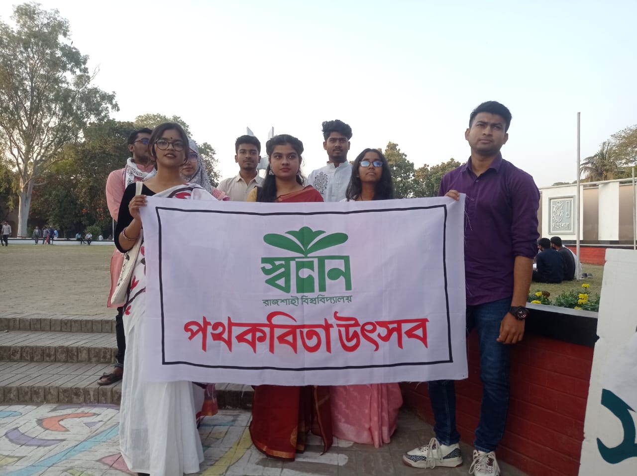 রাজশাহী বিশ্ববিদ্যালয়ে (রাবি) আয়োজন করা হয়েছে পথকবিতা উৎসব। বিশ্ববিদ্যালয়ের সাংস্কৃতিক সংগঠন ‘স্বনন’ এই আয়োজন করে। আবৃত্তি শিল্পীদের কণ্ঠে বিশিষ্ট লেখকদের কবিতা শুনে মুগ্ধ দর্শকশ্রোতা। বৃহস্পতিবার (২৯ ফেব্রুয়ারি) বিকেলে শহিদ মিনারের সামনে বিভিন্ন লেখকের কবিতা আবৃত্তি করেন সংগঠনের সদস্যরা।