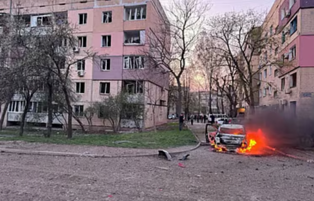 রাশিয়ার হামলায় ইউক্রেনের একটি আবাসিক এলাকায় দাঁড়িয়ে থাকা গাড়িতে আগুন ধরে যায়।
