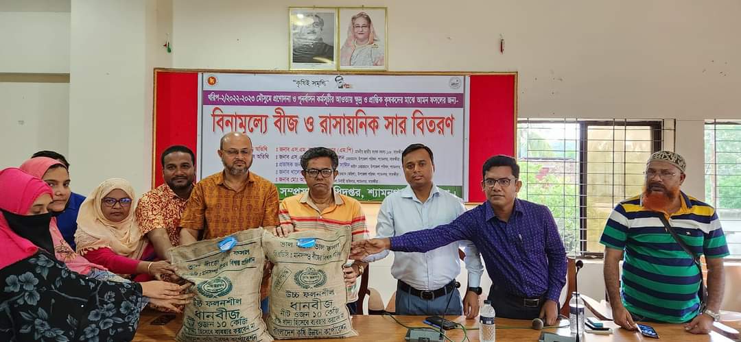 সাতক্ষীরা’র শ্যামনগরে খরিপ-২/২০২২-২০২৩ মৌসুমে প্রণোদনা ও পূনর্বাসন কর্মসূচীর আওতায় উপজেলা বিভিন্ন ইউনিয়নের ১৯০০ জন ক্ষুদ্র ও প্রান্তিক কৃষকদের মাঝে আমন ফসলের জন্য বিনামূল্যে বীজ ও রাসায়নিক সার বিতরণ করা হয়েছে।