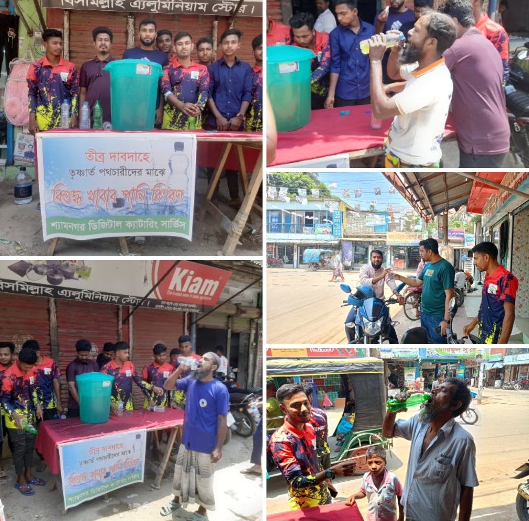 শ্যামনগর ডিজিটাল ক্যাটারিং সার্ভিস এর উদ্দোগে পথচারীদের মাঝে বিশুদ্ধ ঠান্ডা পানি বিতরণ।