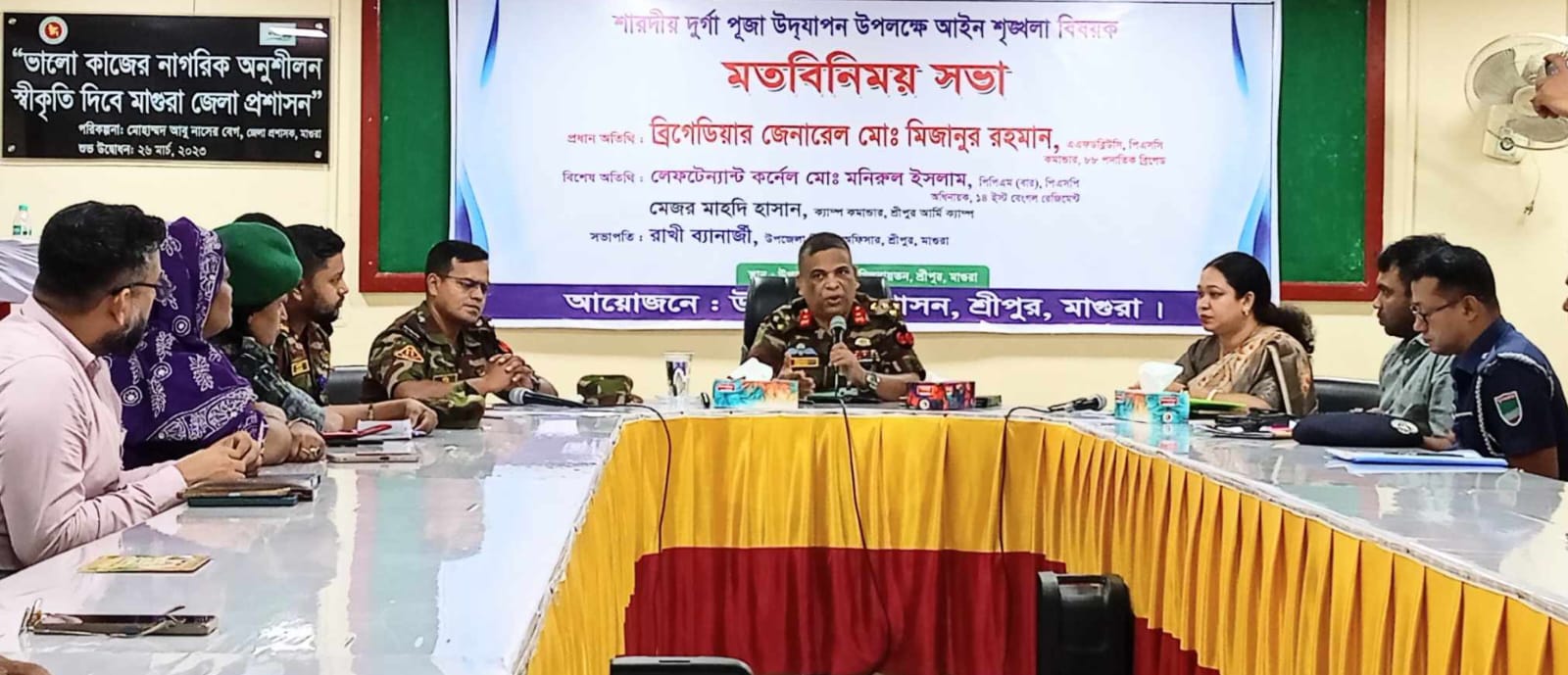 মুজাহিদ শেখ, শ্রীপুর (মাগুরা) প্রতিনিধি :মাগুরার শ্রীপুর উপজেলা পরিষদ মিলনায়তনে মঙ্গলবার বিকেলে শারদীয় দুর্গা পূজা উদযাপন উপলক্ষে আইন শৃঙ্খলা বিষয়ক মতবিনিময় সভা অনুষ্ঠিত হয়েছে। সভায় প্রধান অতিথি হিসেবে বক্তব্য রাখেন ৮৮ পদাতিক ব্রিগেডের কমান্ডার ব্রিগেডিয়ার জেনারেল মোঃ মিজানুর রহমান।