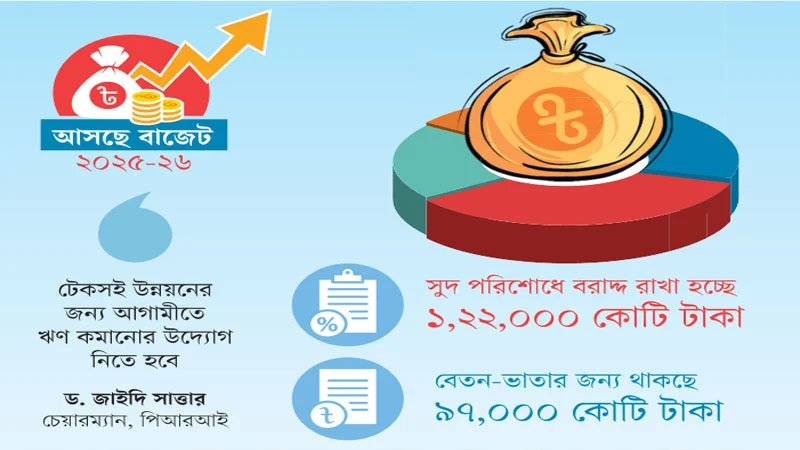 মূল্যস্ফীতি নিয়ন্ত্রণসহ সামষ্টিক অর্থনৈতিক স্থিতিশীলতা ফিরিয়ে আনতে চলতি বাজেটের চেয়েও ছোট বাজেট দিতে যাচ্ছে অন্তর্বর্তী সরকার। আগামী অর্থবছর সরকারি ব্যয় ৭ লাখ ৯০ হাজার কোটি টাকায় রাখার পরিকল্পনা রয়েছে। তবে সার্বিক বাজেট ছোট হলেও সরকারি ব্যয়ের সুদ পরিশোধ ও কর্মকর্তা-কর্মচারীদের বেতন-ভাতায় বরাদ্দ প্রায় ১১ শতাংশ বেড়ে দাঁড়াচ্ছে ২ লাখ ১৯ হাজার কোটি টাকা। যা মোট বাজেটের প্রায় ২৮ শতাংশ। অর্থ মন্ত্রণালয়ের অর্থ বিভাগ সূত্রে এসব তথ্য জানা গেছে। বাজেট প্রণয়নের সঙ্গে যুক্ত কর্মকর্তারা জানিয়েছেন, বেশ কয়েক অর্থবছর থেকেই রাজস্ব সংগ্রহ ভাটায় আর্থিক শৃঙ্খলা নিশ্চিত করা যাচ্ছে না এবং বছর শেষে সরকারকে বিপুল পরিমাণ ঋণ নিতে হয়। দেশি-বিদেশি এ ঋণের বিপরীতে গুনতে হয় বড় অঙ্কের সুদ। এতে করে পরিচালন বাজেটের একক খাত হিসেবে সবচেয়ে বেশি ব্যয় হয় সুদ পরিশোধে। আগামী অর্থবছরে সুদ পরিশোধে ১ লাখ ২২ হাজার কোটি টাকা বরাদ্দ রাখা হচ্ছে। তবে সাম্প্রতিক সময়ের সুদ পরিশোধ বিশ্লেষণ করলে দেখা যায়, এ খাতে ব্যয় আরও বেড়ে যেতে পারে। চলতি অর্থবছরে সুদ পরিশোধের জন্য বরাদ্দ রাখা হয় ১ লাখ ১৩ হাজার ৫০০ কোটি টাকা। অর্থ বিভাগ সূত্রে জানা গেছে, প্রথম আট মাসে (জুলাই-ফেব্রুয়ারি) এ খাতে ব্যয় হয়েছে ৮৫ হাজার ২৫ কোটি টাকা। অর্থবছর শেষে ব্যয় ১ লাখ ২৭ হাজার কোটি টাকা ছাড়িয়ে যেতে পারে। এ খাতে বাড়তি ব্যয়ের কারণ হিসেবে অর্থ বিভাগের কর্মকর্তারা জানিয়েছেন, কভিড-পরবর্তী বাজেট সহায়তা ও মেগা প্রকল্প বাস্তবায়নের জন্য বিপুল পরিমাণ ঋণ নেওয়া হয়। দেশি-বিদেশি উৎসে এখন সরকারের মোট ঋণ প্রায় সাড়ে ১৮ লাখ কোটি টাকার মতো। কিছু প্রকল্পে বড় অঙ্কের স্বল্পমেয়াদি ঋণ নেওয়ায় দ্রুত সুদ ও কিস্তি পরিশোধের চাপ তৈরি হয়েছে, যা সরকারের ব্যয়ের সক্ষমতা কমিয়ে দিয়েছে। সংশ্লিষ্টরা জানান, দেশের মতো বিদেশি ঋণের সুদের হারও বেড়েছে। বিশেষ করে জাপান, বিশ্বব্যাংক ও এশীয় উন্নয়ন ব্যাংক (এডিবি) এখন অনেক ঋণ বাজারভিত্তিক হারে দিচ্ছে। আরেকটি বড় কারণ হলো টাকার অবমূল্যায়ন। চলতি অর্থবছরে প্রতি ডলারে গড় বিনিময় হার ১২০ টাকা যা আগের বছর ছিল ১১১ টাকা। এ ছাড়া দেশে সুদহার বাজারভিত্তিক করায় স্থানীয় উৎস থেকে সরকারের ঋণ গ্রহণের খরচও বেড়ে গেছে। বর্তমানে ট্রেজারি বিল ও বন্ডে সুদের হার ১০ থেকে ১২ শতাংশ, যা ২০২৩ সাল পর্যন্ত ছিল ৮ শতাংশ। এসব কারণেই সার্বিকভাবে সুদ পরিশোধে ব্যয় বেড়েছে। তবে আগামী বাজেটে ঋণ কমানোর পরিকল্পনা রয়েছে। নতুন অর্থবছরে প্রায় ২৬ হাজার কোটি টাকা কমিয়ে দেশি ও বিদেশি মিলে ২ লাখ ৩০ হাজার কোটি টাকার ঋণ নেওয়ার লক্ষ্যমাত্রা নির্ধারণ করা হয়েছে। চলতি অর্থবছরের বাজেটে যা 