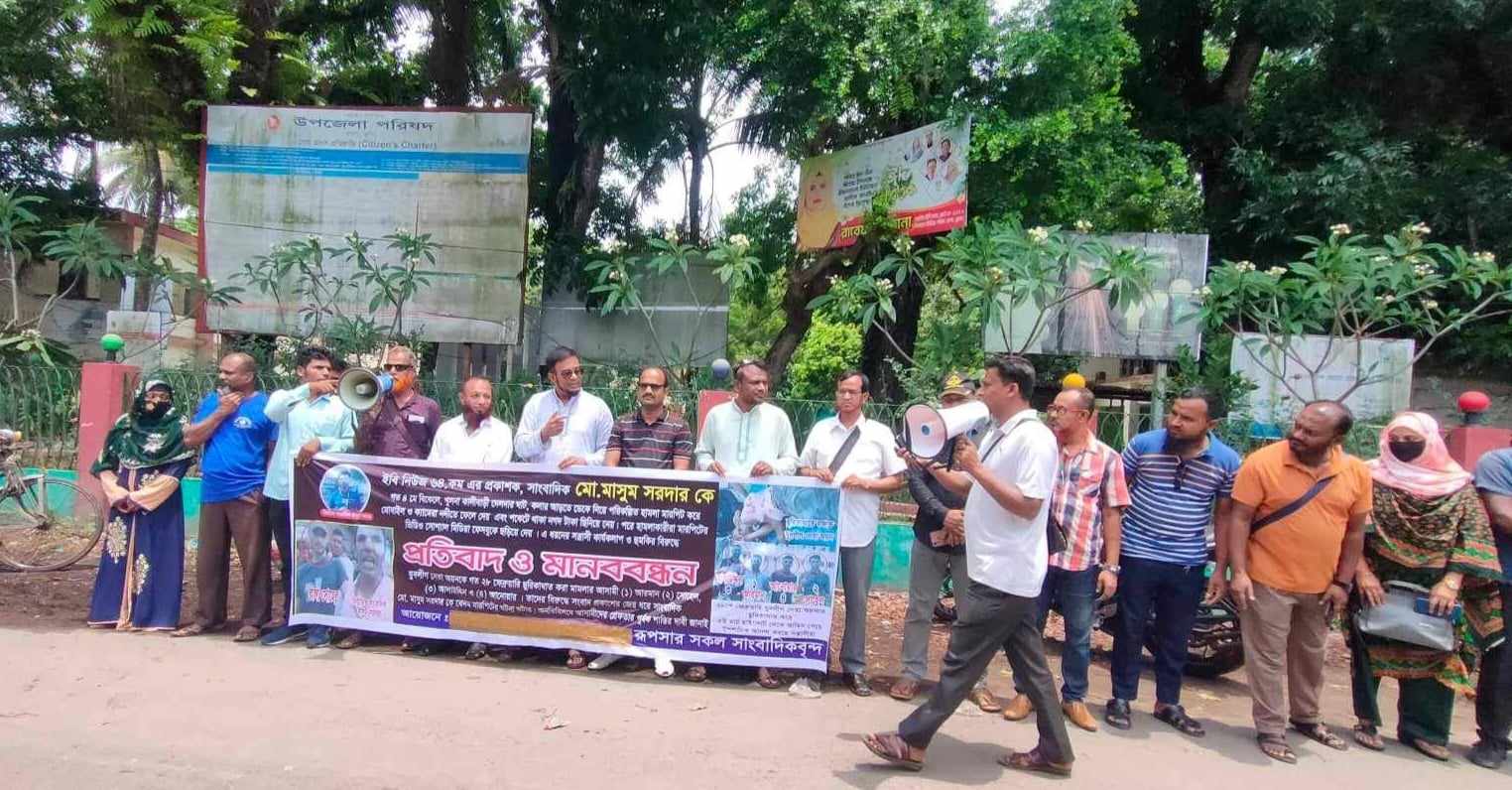 প্রতিবাদ ও মানববন্ধনে প্রধান অতিথির বক্তৃতা করেন রূপসা প্রেসক্লাবের সম্মানিত সভাপতি এসএম মাহবুবুর রহমান। তিনি বলেন- ইবি নিউজ ৬৪.কম এর প্রকাশক, সাংবাদিক মো. মাসুম সরদার কে গত ৪ মে বিকেলে, পরিকল্পিতভাবে হামলা মারপিট করেছে। এমনকি তার মোবাইল ফোন এবং ভিডিও ক্যামেরাটি নদীতে ফেলে দেয়। এরপরে হামলাকারীরা মারপিটের ভিডিও সোশ্যাল মিডিয়া তাদের ফেসবুকে ছড়িয়ে দেয়। এই সন্ত্রাসী কার্যকলাপের বিরুদ্ধে আইনানুগ ব্যবস্থা ও অনতিবিলম্বে গ্রেফতার পূর্বক শাস্তির দাবি জানাই।