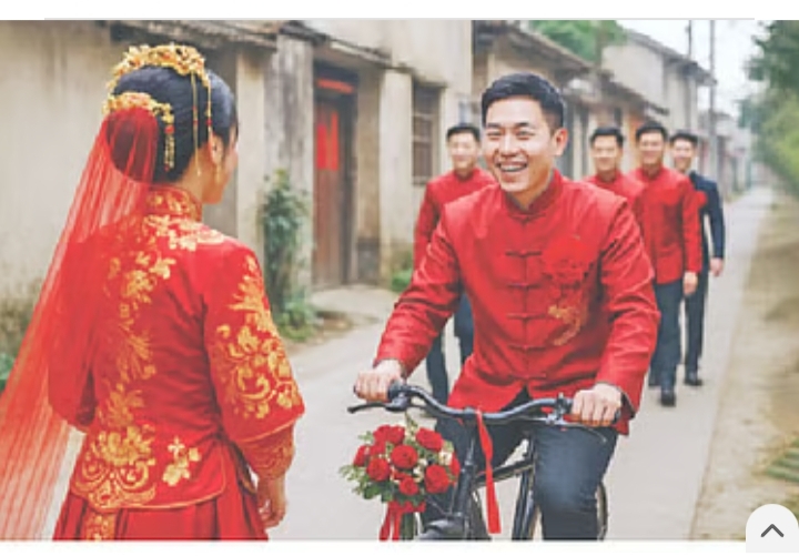 বিয়ে করতে বাইসাইকেলে চেপে কনের বাড়িতে হাজির হয়েছেন বর; গত শতাব্দীর আশির দশকে এমন দৃশ্য হরহামেশা দেখা গেলেও এখন এ দৃশ্য বিরল। অতিথিদের অতীতের সেই কথা মনে করিয়ে দিতেই হয়তো বাইসাইকেলে চেপে কনের বাড়িতে হাজির হয়েছিলেন এক চীনা বর।চীনে সাধারণত বর চেষ্টা করেন দামি গাড়িতে চড়ে বিয়ের জন্য কনের বাড়িতে যেতে। নিজের গাড়ি না থাকলে ভাড়া গাড়ি, এমনকি বন্ধু-স্বজনদের কাছ থেকে ধার করে হলেও দামি গাড়িতে চেপে কনের বাড়িতে যাওয়া চাই। কিন্তু কনে শিং মোটেও তেমনটা চাননি। বরং তাঁর ইচ্ছায়ই তাঁর বর বাইসাইকেল চালিয়ে তাঁকে বিয়ে করতে আসেন।