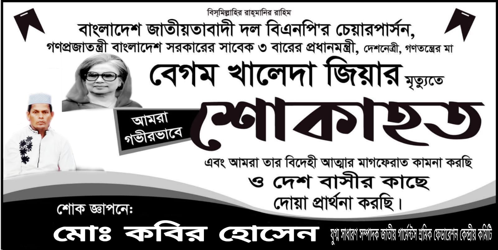 সাবেক প্রধানমন্ত্রী ও বিএনপির চেয়ারপার্সন খালেদা জিয়ার মৃত্যুতে শোক জানিয়েছেন শ্রমিক নেতা মোঃ কবির হোসেন