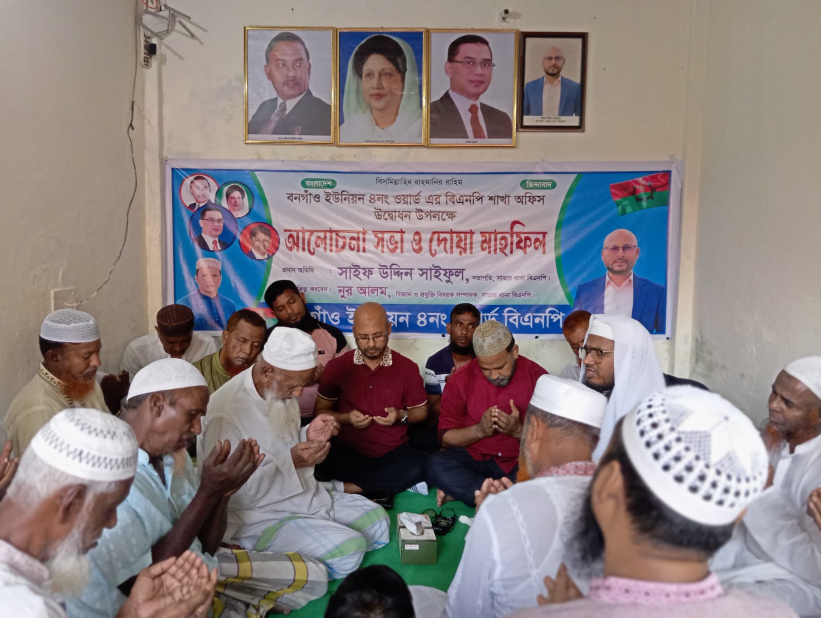 আজ সাভারের বনগাঁও ইউনিয়নের ৪ নং ওয়ার্ডে বিএনপির শাখা অফিস উদ্বোধন আলোচনা সভা ও দোয়া মাহফিল অনুষ্ঠিত হয়, রবিবার বিকালে বনগাঁও ইউনিয়নের গান্দারীয়া চার রাস্তার মোড়ে উক্ত অফিস উদ্বোধন হয়, সাভার থানা বিএনপির বিজ্ঞান ও প্রযুক্তি বিষয়ক সম্পাদক মোঃ নুর আলমের সভাপতিত্বে, উক্ত অনুষ্ঠানে প্রধান অতিথি হিসেবে উপস্থিত ছিলেন সাভার থানা বিএনপির সভাপতি সাইফুউদ্দিন সাইফুল, বিশেষ অতিথি হিসেবে উপস্থিত ছিলেন, সাভার থানা, যুবদলের সাবেক সভাপতি ও সাভার থানা বিএনপির যুগ্ম সাধারণ সম্পাদক গোলাম হোসাইন ডালিম, অন্যান্যদের মধ্যে আরো উপস্থিত ছিলেন, সাভার থানা মৎস্যজীবী দলের সভাপতি মোঃ ডিপু, সাভার থানা মৎস্যজীবী দলের সাধারণ সম্পাদক মোঃ জাকির খান, সহ আরো অনেকেই, এ সময় বিএনপির চেয়ারপার্সন বেগম খালেদা জিয়া, বিএনপির ভারপ্রাপ্ত চেয়ারম্যান তারেক রহমান ও দেশ ও জাতির কল্যাণে মুসলিম উম্মার শান্তির জন্য বিশেষ দোয়া করা হয়।