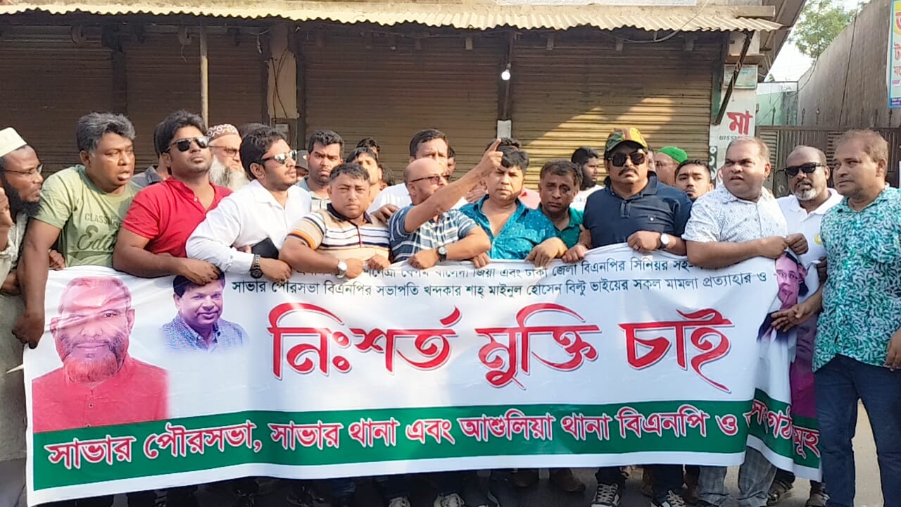 বুধবার , ১ লা মে, ২০২৪, রাজনৈতিক ষড়যন্ত্রমূলক মিথ্যা মামলায় ঢাকা জেলা বিএনপির সিনিয়র সহ-সভাপতি ও সাভার পৌর বিএনপির সভাপতি ও সাভার আশুলিয়া মা মাটি ও মানুষের নেতা জননেতা জনাব খন্দকার শাহ মাঈনুল হোসেন বিল্টু ভাইয়ের জামিন আবেদন বাতিল করে কারাগারে প্রেরণের প্রতিবাদে আশুলিয়ায় বিক্ষোভ মিছিল করেন সাভার পৌর,সাভার থানা ও আশুলিয়া থানা বিএনপি ও অঙ্গ সংগঠনের নেতাকর্মীরা।
